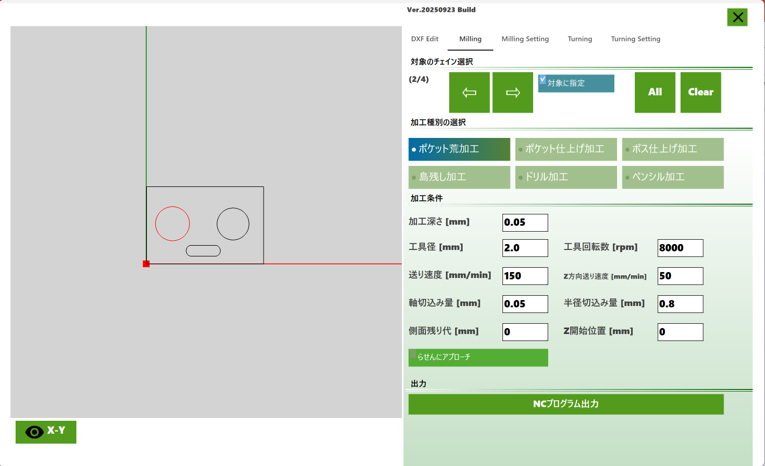 ポケット加工、穴加工、ボス加工、ペンシル加工、島残し加工に必要なNCプログラムを簡便に生成可能。